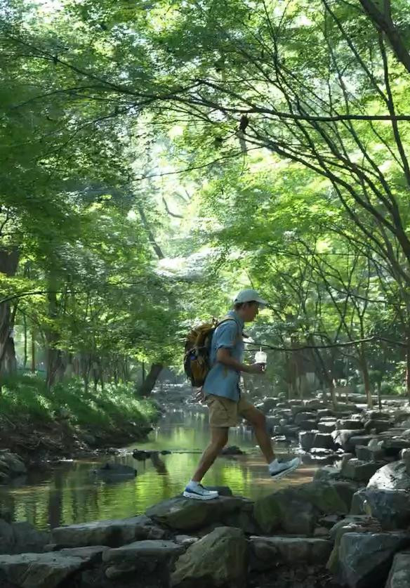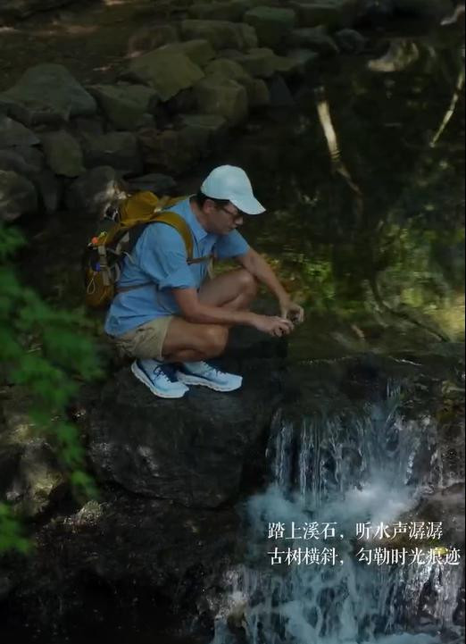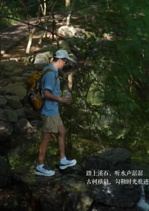 他踏上溪石,听水声潺潺,看横斜的古树,勾勒时光的痕迹。